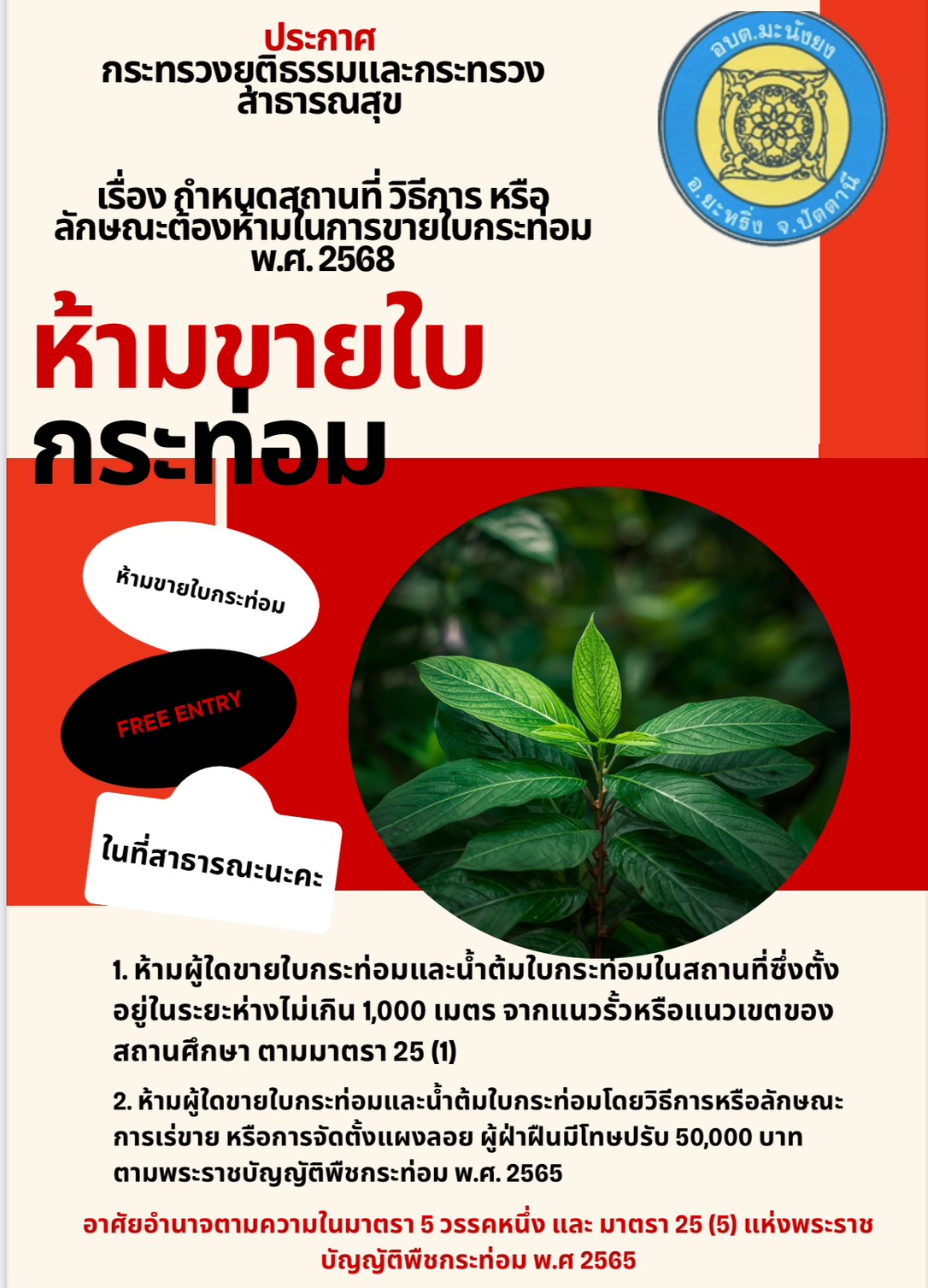 ประกาศกระทรวงยุติธรรมและกระทรวงสาธารณสุข เรื่อง กำหนดสถานที่ วิธีการ หรือลักษณะต้องห้าม ในการขายใบกระท่อม พ.ศ. 2568 มีผลบังคับใช้ตั้งแต่วันที่ 12 ตุลาคม 2568 เป็นต้นไป