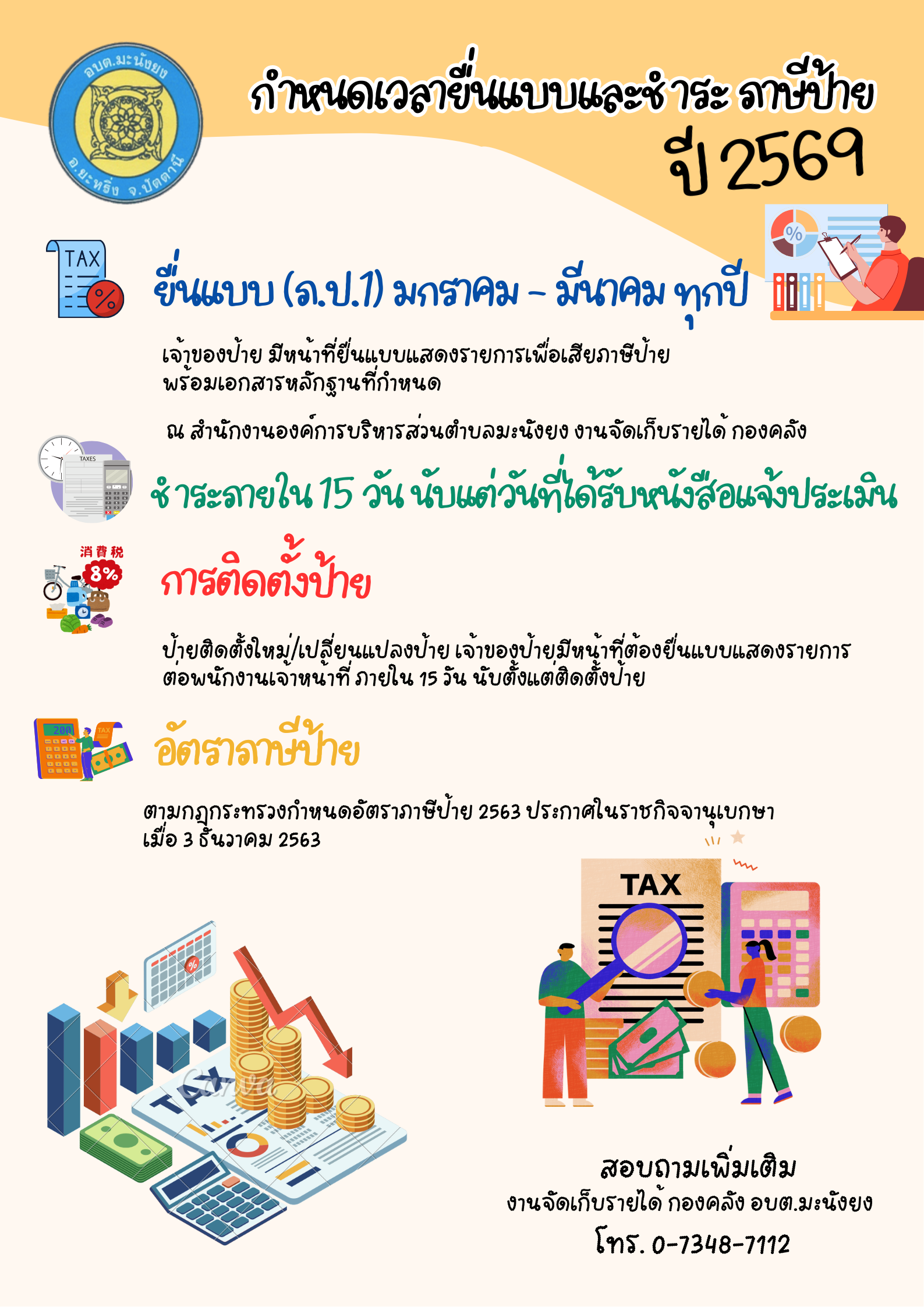 องค์การบริหารส่วนตำบลมะนังยง > งานพัฒนารายได้ > กำหนดเวลายื่นแบบและชำระภาษีป้าย ปี 2569