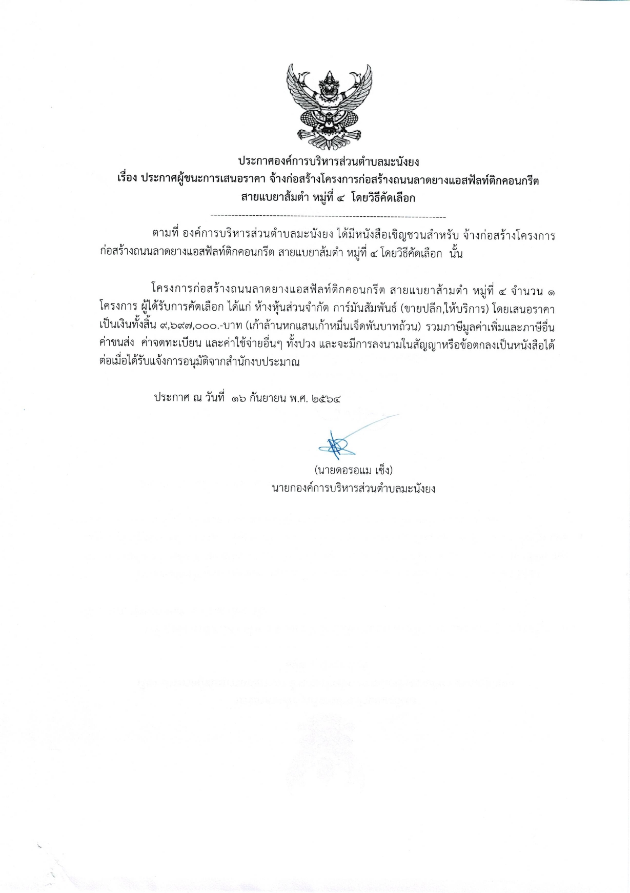 ประกาศผู้ชนะการเสนอราคา จ้างก่อสร้างโครงการก่อสร้างถนนลาดยางแอสฟัลท์ติกคอนกรีด สายแบยาส้มตำ หมู่ที่ 4